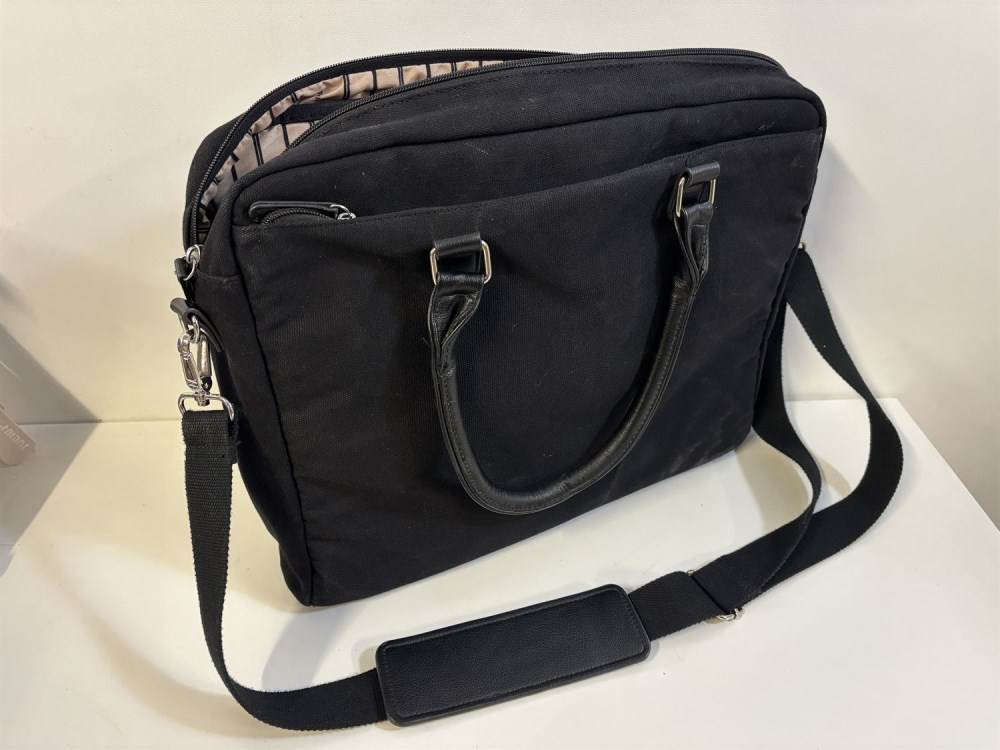 Svart dataväska med rem för att haka fast väskan på din resväska.