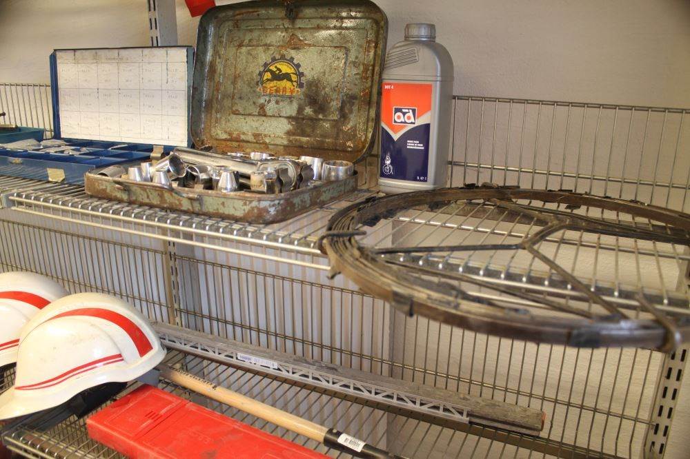 Hylla med exempelvis rensband, VVS-verktyg, plywoodlåda m.m.